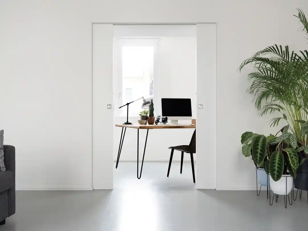 Estensione Syntesis® Line от Eclisse — это скрытый пенал и механизм для двухстворчатых раздвижных дверей без наличников, который позволяет двум полотнам симметрично заезжать в стену и полностью «исчезать» в проёме. Такая система для невидимых дверей используется, когда важны минимализм, бесшовная стена и современный интерьер.