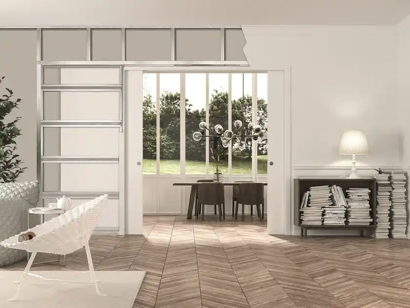 Sistemul Estensione Eclisse este soluția ideală pentru uși glisante duble, care se deschid și se închid simetric. Conceput pentru spații moderne și elegante, acest sistem pentru uși glisante este perfect pentru apartamente, birouri sau spații comerciale din Chișinău unde este nevoie de funcționalitate și design sofisticat.